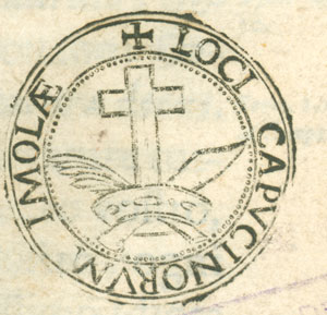 Sello circular a tinta negra, en port., con la cruz franciscana y la leyenda: "Imolae loci Capucinorum"