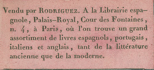 Etiqueta de librero: "Vendu par Rodriguez. A la Libraire espagnole, Palais-Royal, Cour des Fontaines, n. 4, à Paris..."