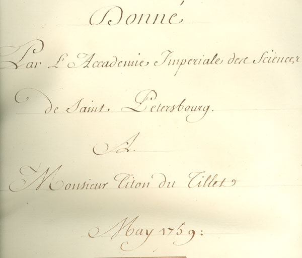 Anot. ms.: "Donné par l'Academie Imperiale des Sciences de Saint Petersbourg a Monsieur Titon du Tillet, May 1759"