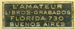 Etiqueta, sobre fondo negro: "L'Amateur libros-grabados Florida, 730 Buenos Aires".