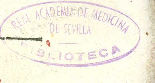 Sello de tampón en tinta azul, ovalado en horizontal: "Real Academia de Medicina de Sevilla. Biblioteca"