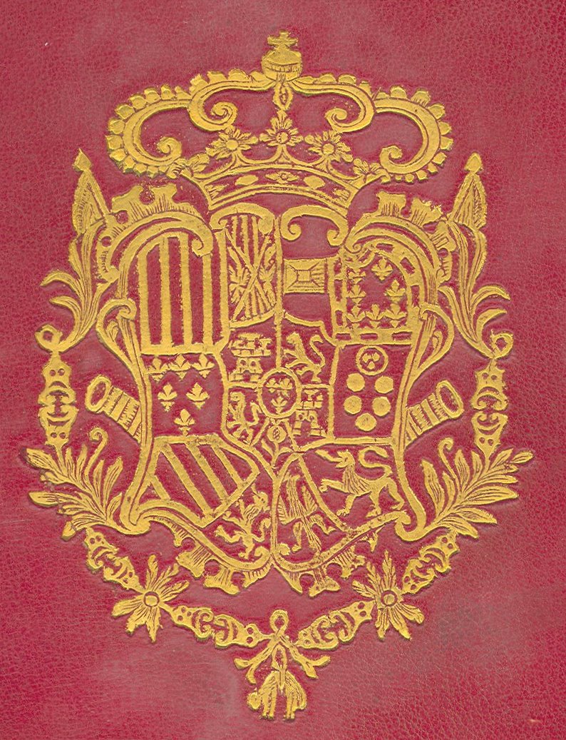 Escudo acolado: blasón 1º, Escudo cuartelado: Castilla, 1º y 4º, De gules, castillo de oro con tres torres mazonado de sable y aclarado de azur; León, 2º y 3º, De plata, león rampante de púrpura coronado de oro, linguado y uñado de gules; Aragón, De oro, cuatro palos de gules; Dos Sicilias, De plata, cuartelado en sotuer, 1º y 4º de Aragón, 2º y 3º, De plata, un águila de sable, coronada de oro, picada y membrada de gules; Austria, De gules, faja de plata con bordura; Borgoña moderna, De azur, sembrado de flores de lis de oro y bordura componada, cantonada de plata y gules; Borgoña antigua, bandado en cuatro bandas en oro y azur con bordura componada de plata y gules; Brabante, De sable, león rampante de oro, linguado y uñado de gules; entado en punta, partido, Flandes, De oro, león rampante en sable, lenguado y armado de gules; Tirol, De plata, águila de gules, coronada, picada y membrada de oro, cargada el pecho de un creciente trebolado de lo mismo; y sobre el todo, diferencia de Francia o escusón de azur con tres lises de oro, dos en jefe y una en punta; 2º blasón, Portugal, De plata, cinco escusones de azur, puestos en cruz, cargados cada uno de cinco bezantes de plata, colocados en sotuer, y una bordura de gules cargada de siete castillos de oro, tres en jefe, dos en flanco y dos hacia la punta; al timbre, corona real de ocho florones (cinco vistos).