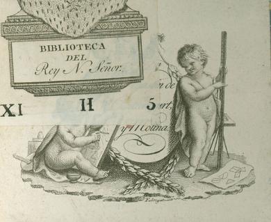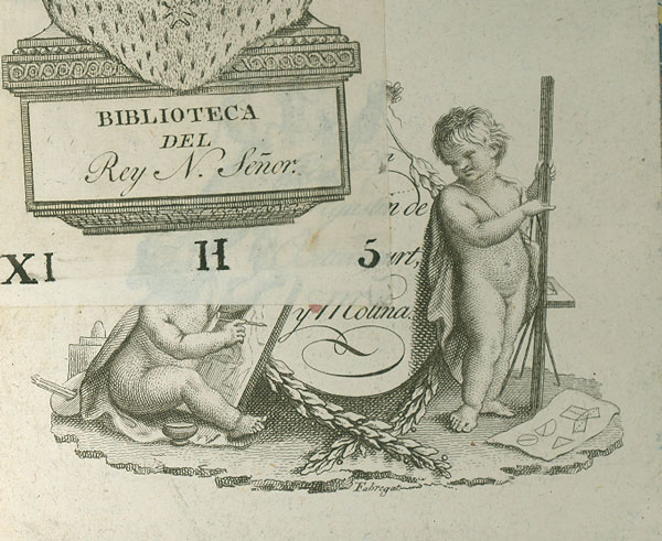 Exlibris grab. calc.: Óvalo que contiene su nombre, sujeto por angelotes y alegorías de las ciencias y técnicas.
