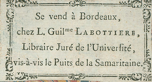 Etiqueta en orla: "Se vend à Bordeaux, chès L.-Guilme Labottiere, Libraire Juré de l'Université, vis-à-vis le Puits de la Samaritaine"