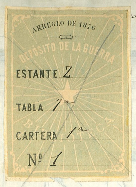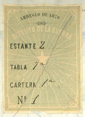 Etiqueta col. verde con localización topográfica de la pieza en el Depósito de la Guerra.