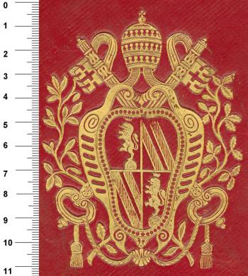 Escudo cuartelado: 1º y 4º, De azur, león rampante de oro, linguado, uñado y coronado, a la diestra, sobre sol de oro, 2º y 3º, De plata, dos bandas de gules de diestra a siniestra; al timbre, tiara pontificia, llaves de san Pedro y ramos de mirto